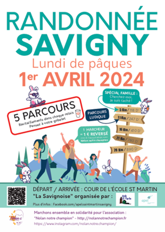 Evènements Plusieurs évènements auront lieu afin de récolter des dons pour Nolan et de faire connaître sa maladie ! 1er avril 2024 Randonnée à Savigny (69) L’école Saint Martin, de Savigny, organise une journée randonnée avec 5 parcours : 5 km : Spécial famille11 km16 km21 km28 km1 marcheur = 1€ reversé à notre association ! On vous attend nombreux pour passer une belle journée avec nous !! envie de nous soutenir ? Grâce à vous, la vie de Nolan ne pourra être que plus belle ! faire un don